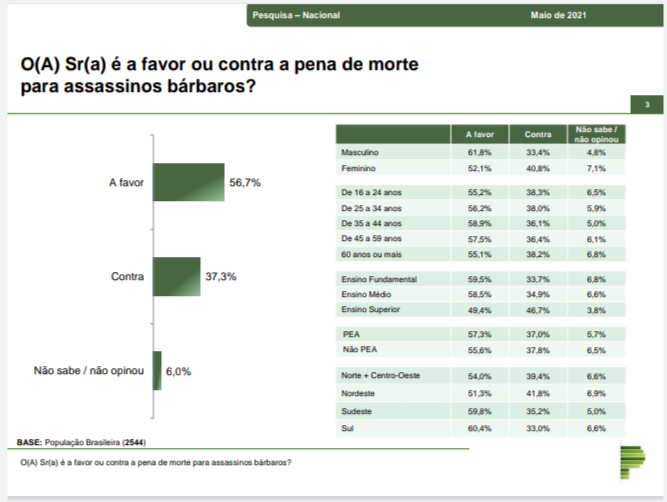 Nesta terça, 25, o Paraná Pesquisas divulgou um levantamento sobre o posicionamento dos brasileiros a respeito da pena de morte para ‘assassinos bárbaros’ e mostra que 56,7% dos entrevistados se declaram a favor dessa prática ante 37,3% que são contra a medida extrema. Outros 6% não souberam responder.
