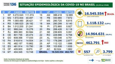 Já o total de pessoas que não resistiram à covid-19 alcançou 462.791. Entre ontem e hoje, foram confirmadas 860 mortes resultantes da pandemia. Ontem, o número de óbitos estava em 461.931.