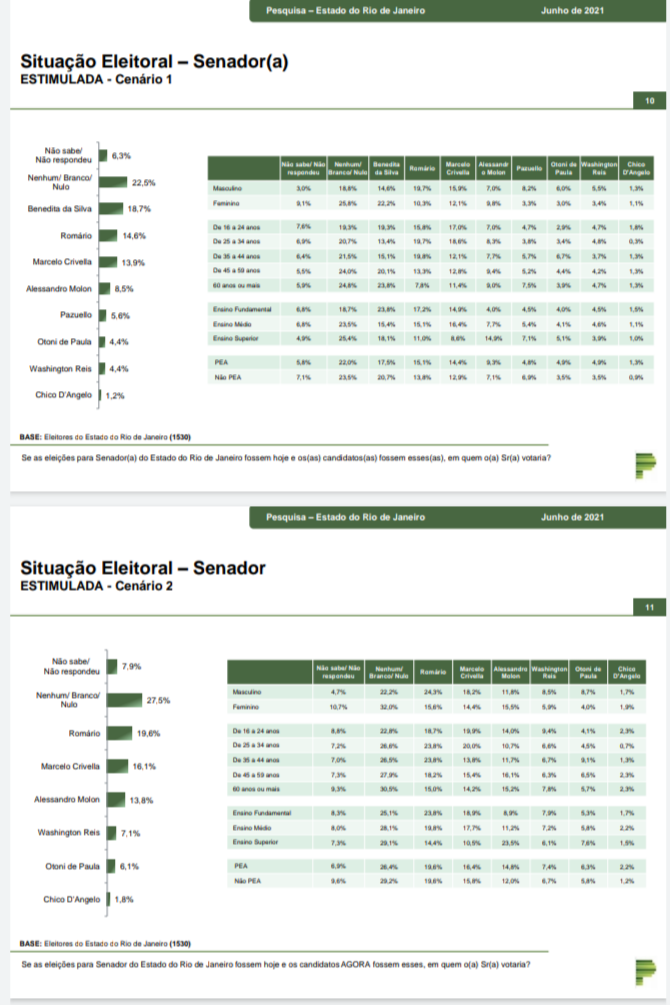 Na sequência, aparece o senador Romário (PL) com 14,6%, Marcelo Crivella (Republicanos) com 13,9% e Alessandro Molon (PSB) com 8,5%. Branco e Nulo, 22,5% e Não sabe, 6,3%.