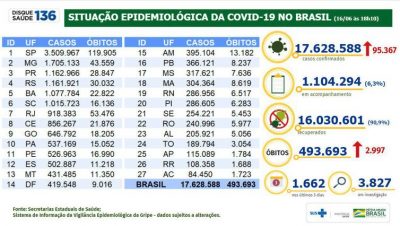 Com os novos casos, o país acumula 17.628.588 pessoas infectadas pelo novo coronavírus desde o início da pandemia. Ontem (15), o sistema de dados do ministério trazia 17.533.221 casos acumulados. O país tem ainda 1.104.294 casos ativos, em acompanhamento.