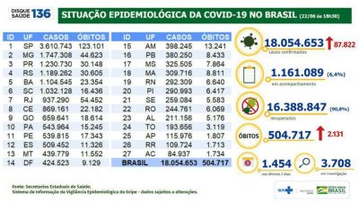 A quantidade de pessoas que sucumbiram à pandemia chegou a 504.717. Nas últimas 24 horas, foram registradas 2.131 novas mortes por covid-19. Ontem, o número de vítimas que perderam a vida em função de complicações vinculadas à doença estava em 502.586.