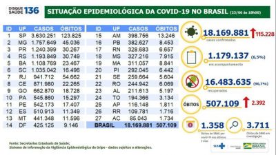 Agência Brasil — O Brasil chegou a 507.109 mortes por covid-19. Nas últimas 24 horas, foram 2.392 óbitos e 115.228 novos casos. No total, 18.169.881 casos foram confirmados no país. Existem 3.711 mortes em investigação por equipes de saúde, dados relativos a ontem. Isso porque há casos em que o diagnóstico sobre a causa só sai após o óbito do paciente. O número de pessoas recuperadas totalizou 16.483.635.