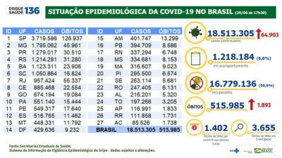 Agência Brasil — A quantidade de pessoas infectadas pelo novo coronavírus desde o início da pandemia chegou a 18.513.305 em todo o Brasil. Em 24 horas, as autoridades de saúde registraram 64.903 novos casos da covid-19.
