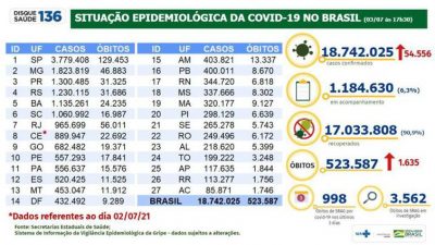 Entre os casos já confirmados, 17.033.808 pacientes se recuperaram, o que representa 90,9% do total de pessoas que adoeceram. Outros 1.184.630 pacientes continuavam sob acompanhamento médico até as 17h30 deste sábado – o que representa 6% do total. Além disso, há 3.562 casos considerados suspeitos em investigação, à espera do resultado dos exames.