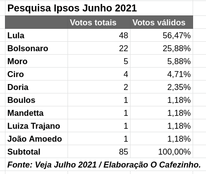Nova pesquisa de intenção de votos para as eleições presidenciais de 2022, do instituto Ipsos, traz o ex-presidente Lula com 56,5% dos votos válidos, o que significaria uma vitória folgada no primeiro turno. Segundo a Veja, que divulgou os números, a pesquisa foi encomendada pelo DEM. Abaixo, os percentuais de cada candidato, em votos totais: […]
