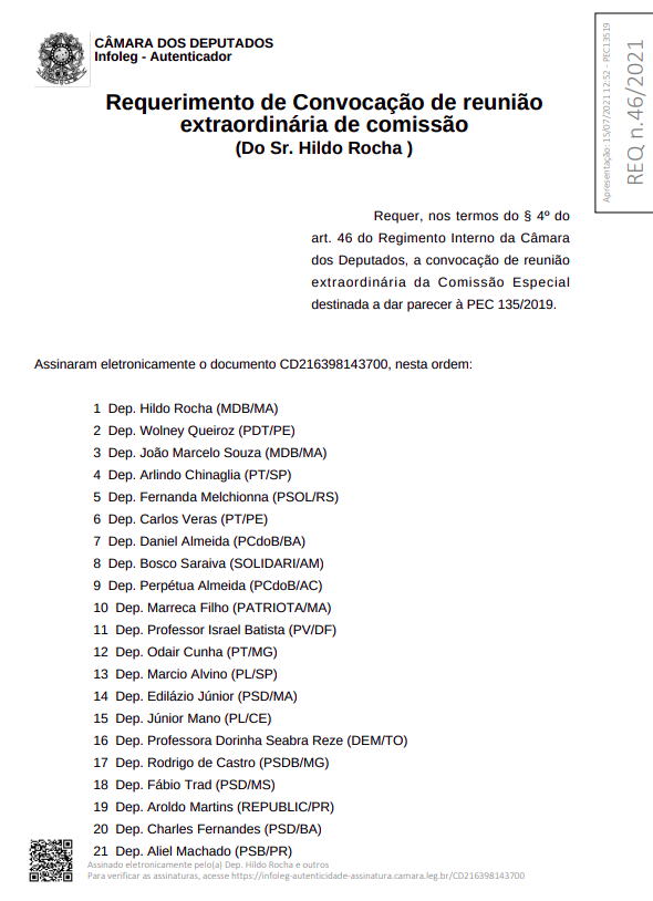 Dos 34 titulares da comissão, o requerimento de autoconvocação foi assinado por 21 deputados.