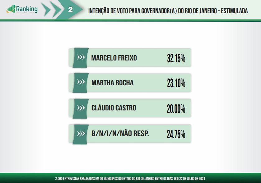 Na pesquisa espontânea, Freixo aparece com 16%, o dobro de Martha Rocha, e mais que o triplo da pontuação obtida pelo governador Cláudio Castro. Rodrigo Neves, postulando ao governo do estado pelo PDT, aparece com 1,35%.