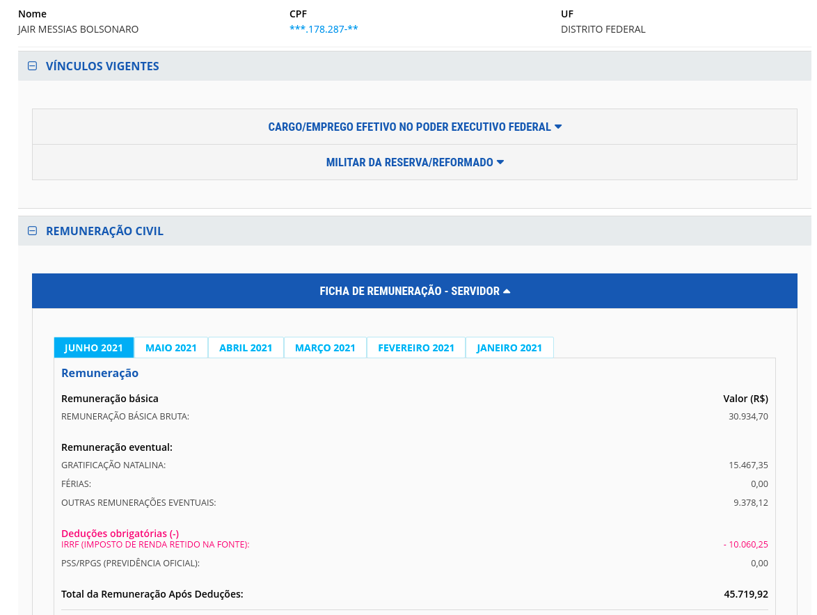 Em junho de 2021, o presidente recebeu R$ 45,7 mil em salários, o que é um valor 16% acima do teto constitucional de R$ 39,3 mil.