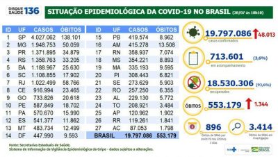 Já a quantidade de casos acumulados desde o início da pandemia chegou a 19.797.086. Em 24 horas, as autoridades de saúde confirmaram 48.013 diagnósticos positivos de covid-19.
