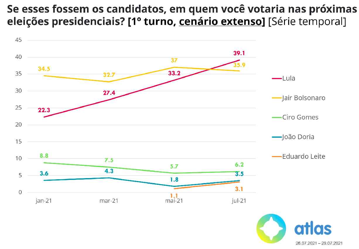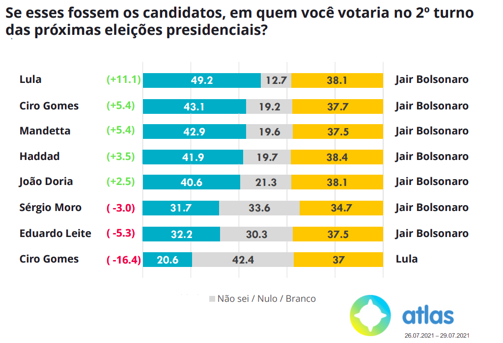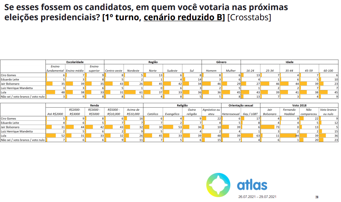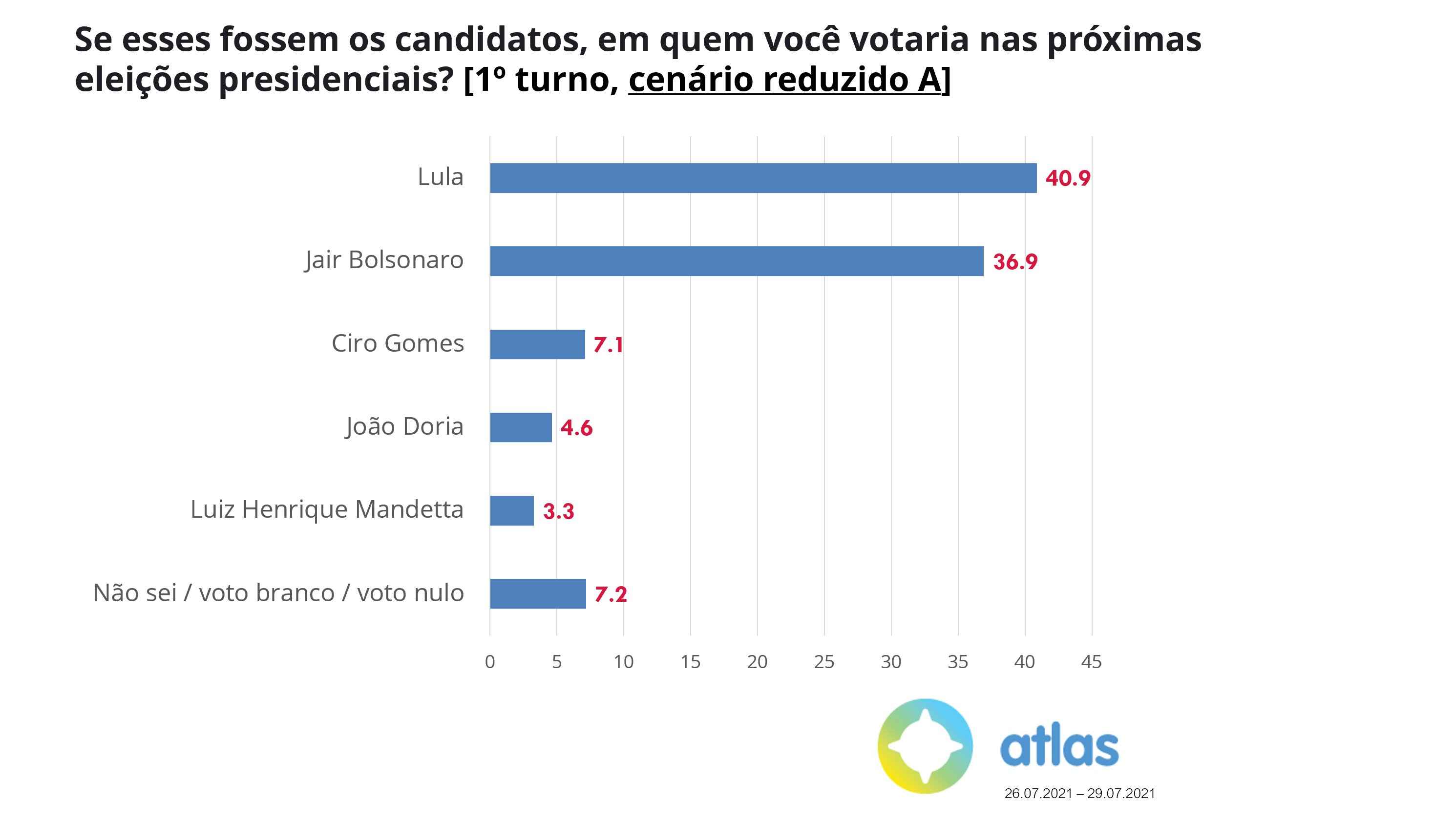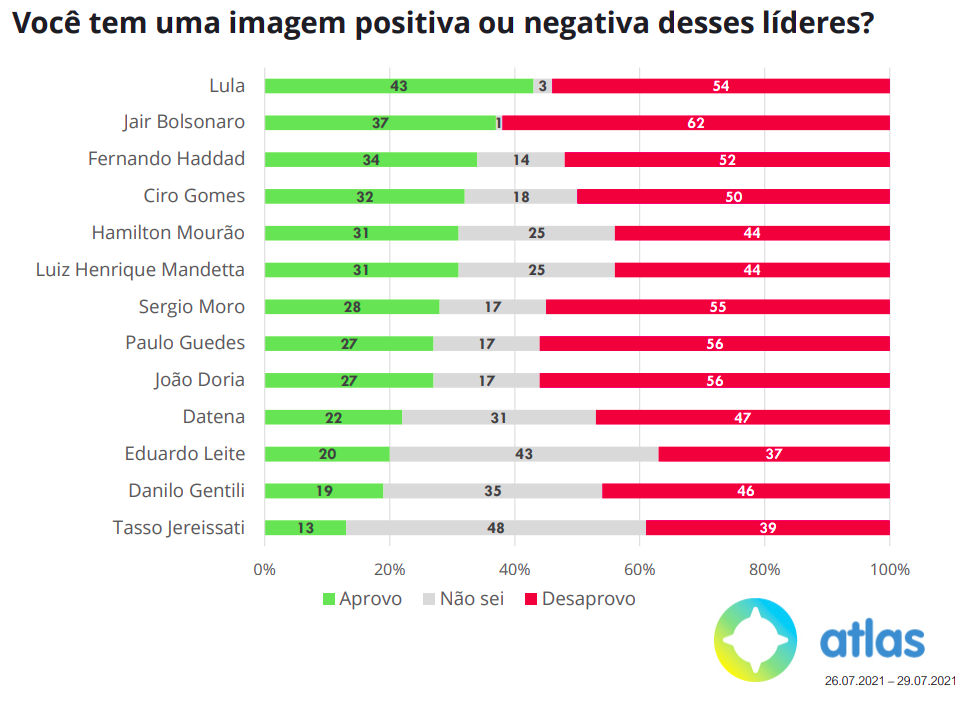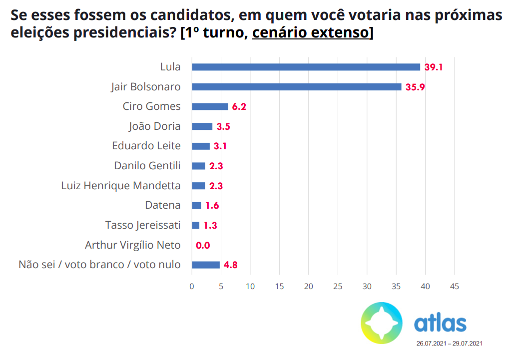 A pesquisa Atlas não é tão ruim para Bolsonaro como outras. No último Datafolha (de 7 e 8 de julho), por exemplo, Bolsonaro aparece com 25%. Aqui no Atlas, ele tem 35,9%.
