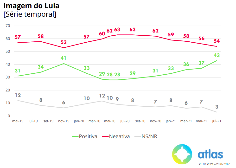 Lula ainda tem uma rejeição relativamente alta (é bem menor que a de Bolsonaro), mas a linha positiva vem crescendo de maneira firme. Após chegar a um mínimo de 28% de positivo em maio de 2020, hoje já tem 43%.