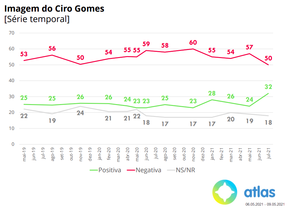 A imagem de Ciro Gomes apresentou melhora nos últimos meses. A linha negativa caiu 7 pontos, de 57 para 50, e a positiva subiu 8 pontos, passando de 24 para 32. Já é uma imagem bem melhor, por exemplo, do que a de Sergio Moro, que hoje tem 28% de positivo e 55% de negativo.