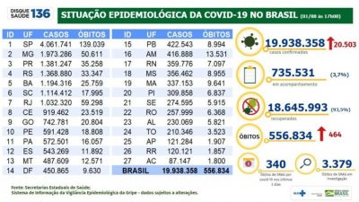 Desde o início da pandemia, o Brasil acumula 19.938.358 diagnósticos e 556.834 mortes por covid-19. Segundo a pasta, 18.645.993 se recuperaram da doença.