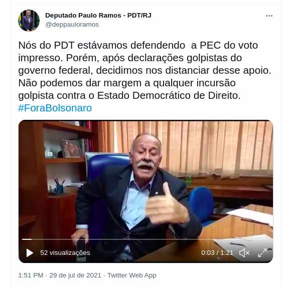 Nós do PDT estávamos defendendo a PEC do voto impresso. Porém, após declarações golpistas do governo federal, decidimos nos distanciar desse apoio. Não podemos dar margem a qualquer incursão golpista contra o Estado Democrático de Direito. #ForaBolsonaro pic.twitter.com/Qent5m9ZEt