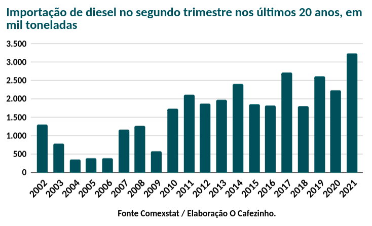 No segundo trimestre de 2021 (mai/jul), o Brasil registrou o maior volume de importação de óleo diesel de sua história. Foram importadas 3,2 milhões de toneladas de diesel, quase tudo dos Estdos Unidos.