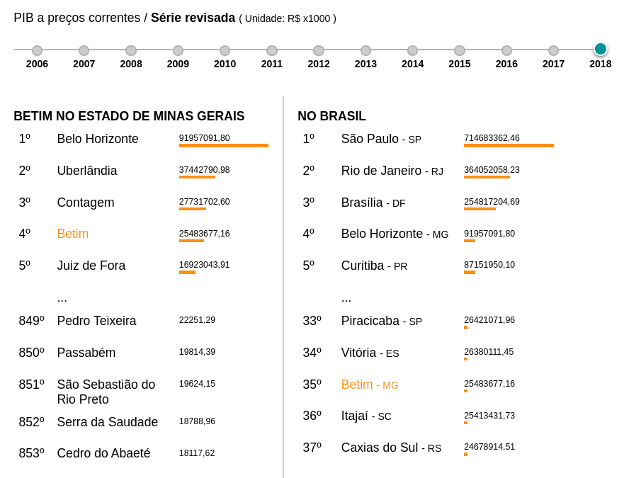 Separei três gráficos atualizados do IBGE com a posição de Betim no ranking de Minas Gerais e do Brasil.