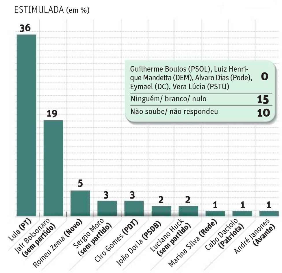 Na estimulada, o presidente Lula pontua 36%, quase o dobro de Bolsonaro, que tem 19%.