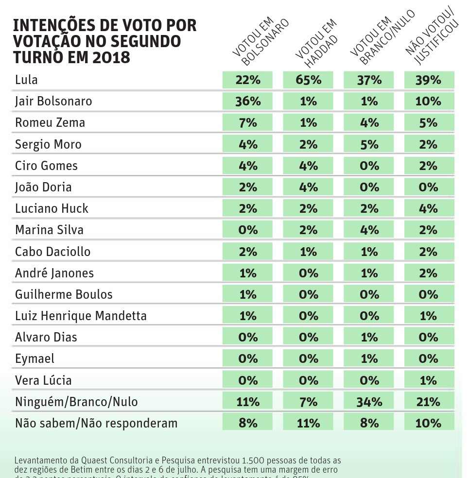 A pesquisa fez um cruzamento entre as intenções de voto atuais dos entrevistados, com o voto declarado no segundo turno de 2018. A tabela traz números interessantes.
