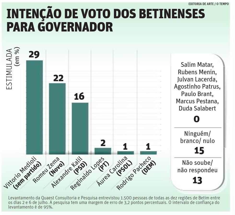 Em primeiro lugar vem o atual prefeito de Betim, Vittorio Medioli, hoje no PSD, com 29%. Em segundo, vem o atual governador do estado, Romeu Zema.