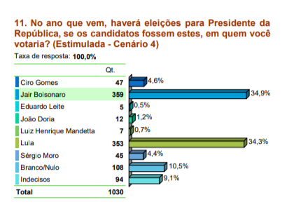 Na chamada terceira via, Ciro Gomes (PDT) e Sérgio Moro também estão empatados com seus 4,6% e 4,4%, respectivamente, mostrando que até o momento, uma candidatura alternativa ainda não emplacou. Branco e Nulo são 10,5% e Indecisos, 9,1%.