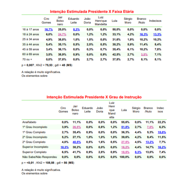 Nos dados quantitativos por segmento, o líder petista registra maiores índices entre os jovens de 16 a 17 anos (50%) e eleitores com 60 ou mais (42,8%). Em grau de instrução, Lula apresenta major porcentagem de apoio entre eleitores com Ensino Fundamental incompleto com 51,8% enquanto Bolsonaro apresenta major índice entre eleitores com Ensino Superior Completo com 41,7%.