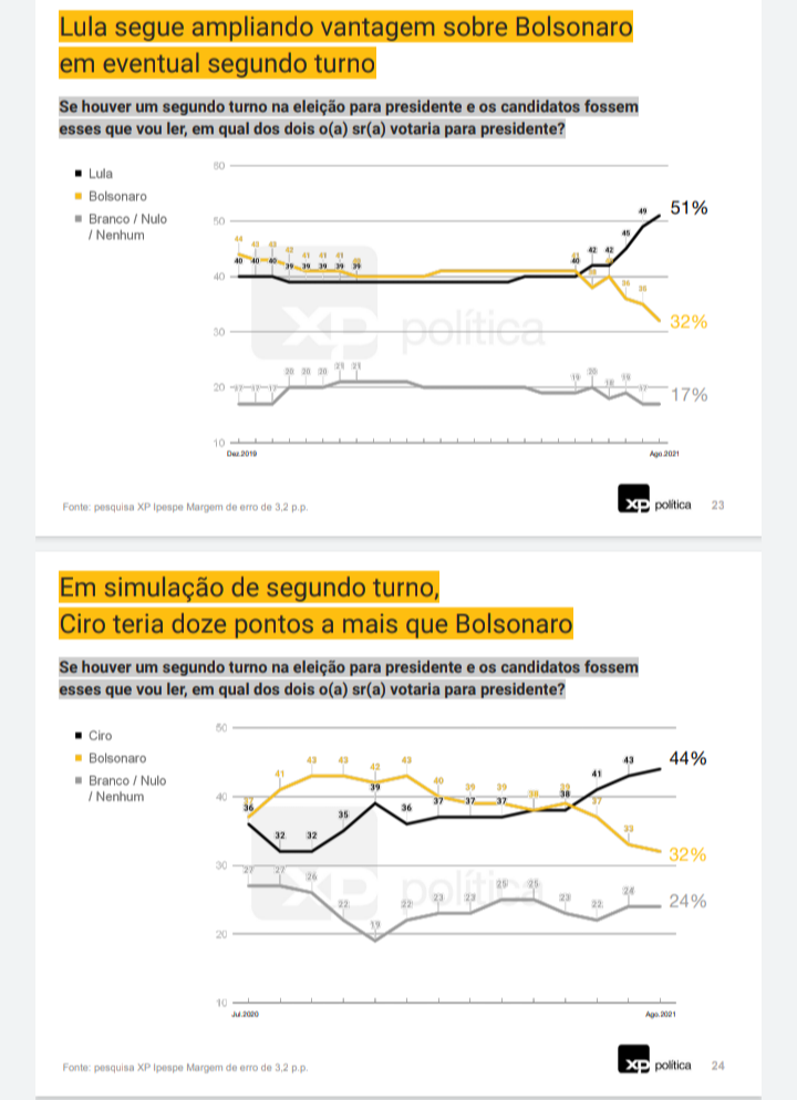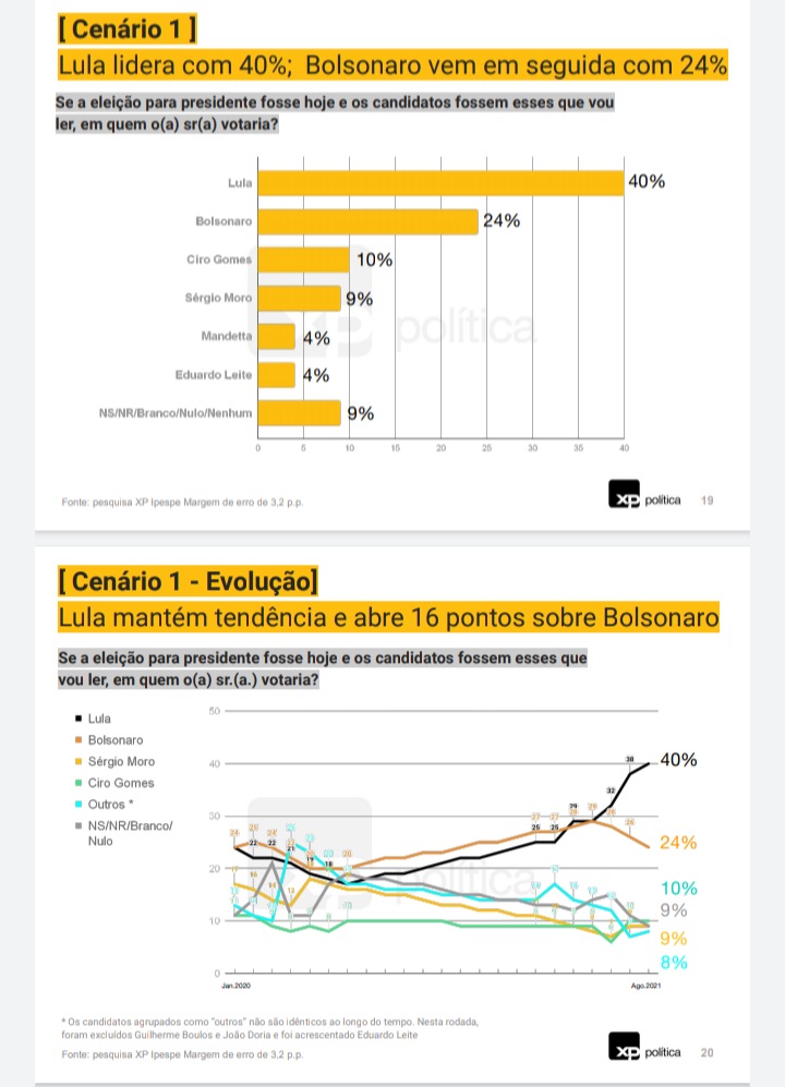 A XP ouviu mil eleitores em todas as regiões do Brasil entre os dias 11 a 14 de agosto. A margem de erro é de 3,2 pontos percentuais para mais ou para menos.