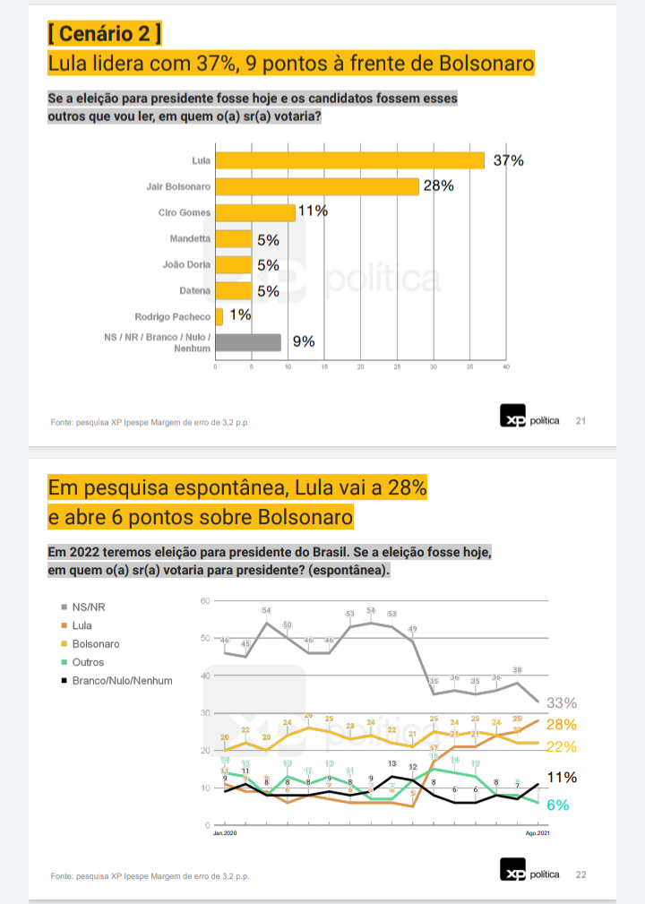 No início da tarde desta terça-feira, 17, a XP Investimentos divulgou uma nova pesquisa de intenção de voto para a presidência da República e mostra que o ex-presidente Lula (PT) ampliou sua vantagem diante de Jair Bolsonaro.