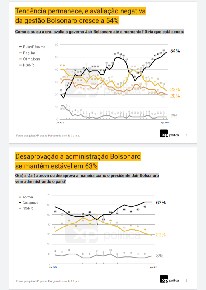 A pesquisa XP/Ipespe divulgada na tarde desta terça-feira, 17, também mostra que Jair Bolsonaro continua enfrentando uma crise de impopularidade.