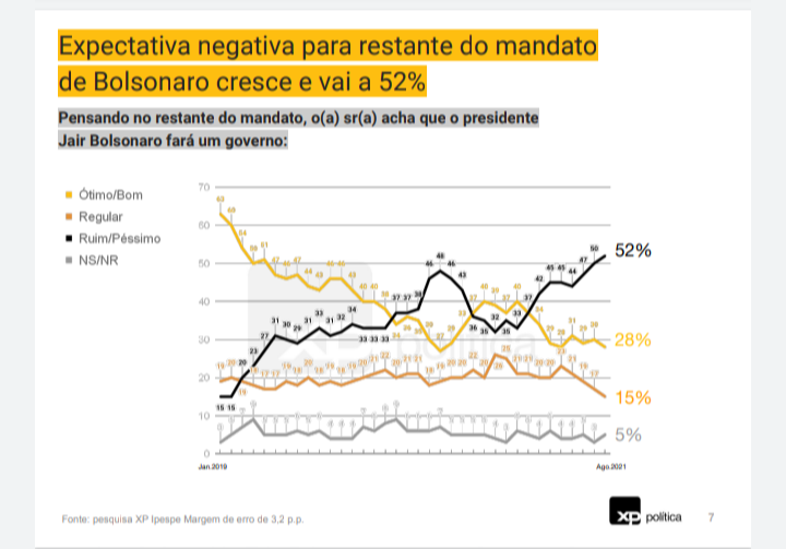 O levantamento também perguntou sobre a expectativa dos eleitores para o resto de mandato de Bolsonaro. Para 52%, a expectativa é ruim/péssimo, 28% ótimo/bom e 15% regular.