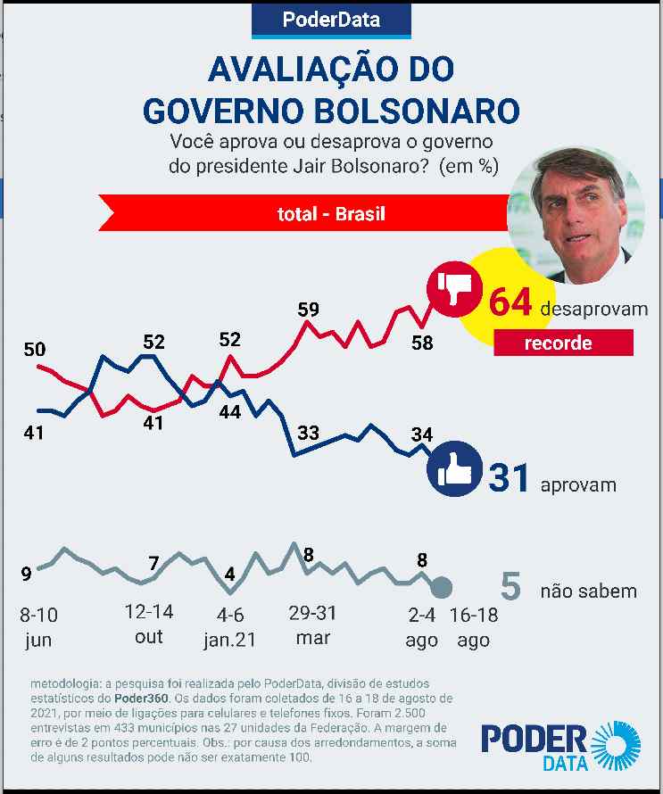 A avaliação do governo, dividida entre aprovação e desaprovação, é ainda pior, o que indinca que a maior parte dos entrevistados que dão nota “regular” tendem a desaprovar a administração. Segundo a pesaquisa, 64% dos eleitores desaprovam o governo Bolsonaro, o que é um recorde desde que o PoderData começou a colher dados.
