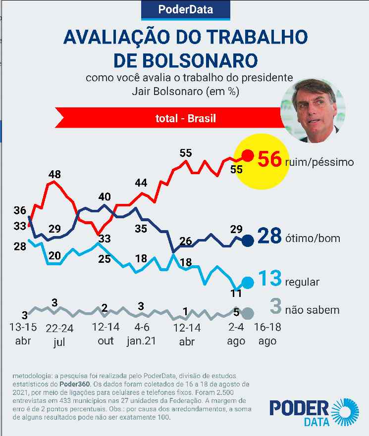 Segundo a pesquisa, o percentual de eleitores que consideram o trabalho do presidente Bolsonaro como “ruim/péssimo” subiu para 56%, o que é o pior índice do início da série. Já o percentual de eleitores que consideram o governo como “ótimo/bom” caiu para 28%.