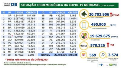 Agência Brasil — O total de pessoas contaminadas pelo novo coronavírus desde o início da pandemia alcançou 20.703.906. Entre ontem e hoje, as secretarias de saúde registraram 27.345 novos casos covid-19.