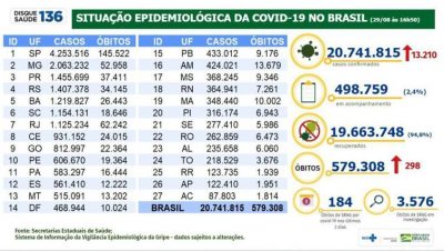 Agência Brasil — O Ministério da Saúde divulgou hoje (29) novos números sobre a pandemia de covid-19 no país. De acordo com levantamento diário feito pela pasta, o Brasil tem, desde o início da pandemia, 20,7 milhões de casos confirmados da doença e 579,3 mil mortes registradas. O número de recuperados soma 19,6 milhões.