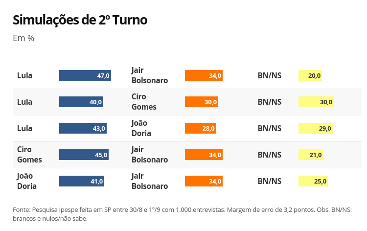 Para efeito de comparação, uma pesquisa Ibope de junho de 2018, feita igualmente com cerca de mil entrevistas apenas no estado de São Paulo, mostrava Lula com 24%, Bolsonaro com 17%, Alckmin (PSDB) com 13% e Ciro com 4%.