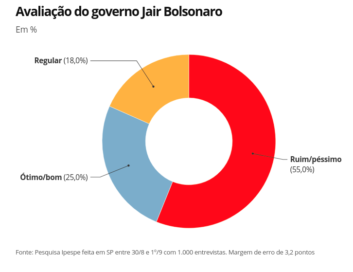 A avaliação do governo Bolsonaro em São Paulo é ruim para o presidente. Segundo a pesquisa Valor/Ipespe, 55% dos paulistas consideram seu governo ruim ou péssimo, contra apenas 25% que o consideram ótimo e bom.