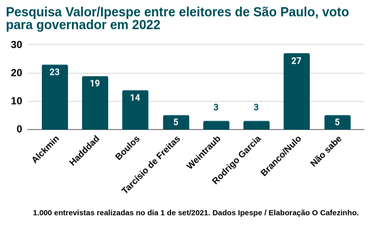 A pesquisa do Valor/Ipespe também traz um cenário para o governo do estado, e aí identificamos um dado curioso. O número de brancos/nulos é imenso, 27%, mais 5% de indecisos, o que indica a possibilidade de mudanças expressivas no desempenho dos principais candidatos.