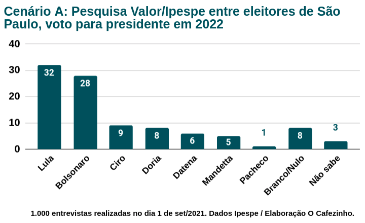 No cenário A, com Doria (PSDB), Datena (PSL) e Mandetta (DEM) disputando a quarta via, Lula tem 32%, Bolsonaro 28% e Ciro 9%.