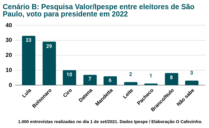 O cenário B, com Eduardo Leite no lugar de Doria mostra o desempenho ainda muito fraco do governador do Rio Grande do Sul, com apenas 2%. Os votos de Doria parecem se diluir entre vários candidatos: Lula, Bolsonaro, Ciro, Datena e Mandetta, todos oscilam um ponto para cima.