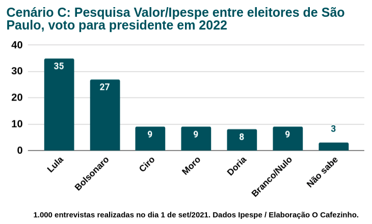 O cenário C, mais enxuto, com apenas Moro e Doria disputando a quarta via, traz Lula em sua melhor posição, com 35%, abrindo 8 pontos de vantagem sobre Bolsonaro.