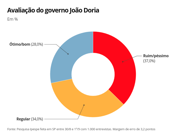 É importante destacar que a avaliação do governo Doria, embora não seja lá muito boa (o que se reflete no desempenho medíocre do governador nas pesquisas de intenção de voto), é menos pior que a de Bolsonaro: 37% dos paulistas acha sua administração ruim ou péssima, contra 28% que a consideram ótima ou boa.