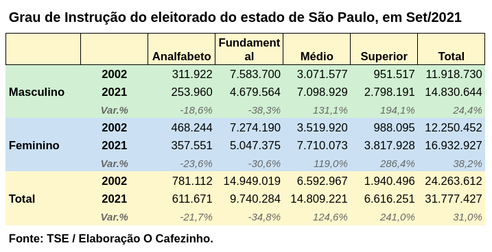 Fizemos um comparativo do grau de instrução do eleitorado paulista entre 2002 e 2021.