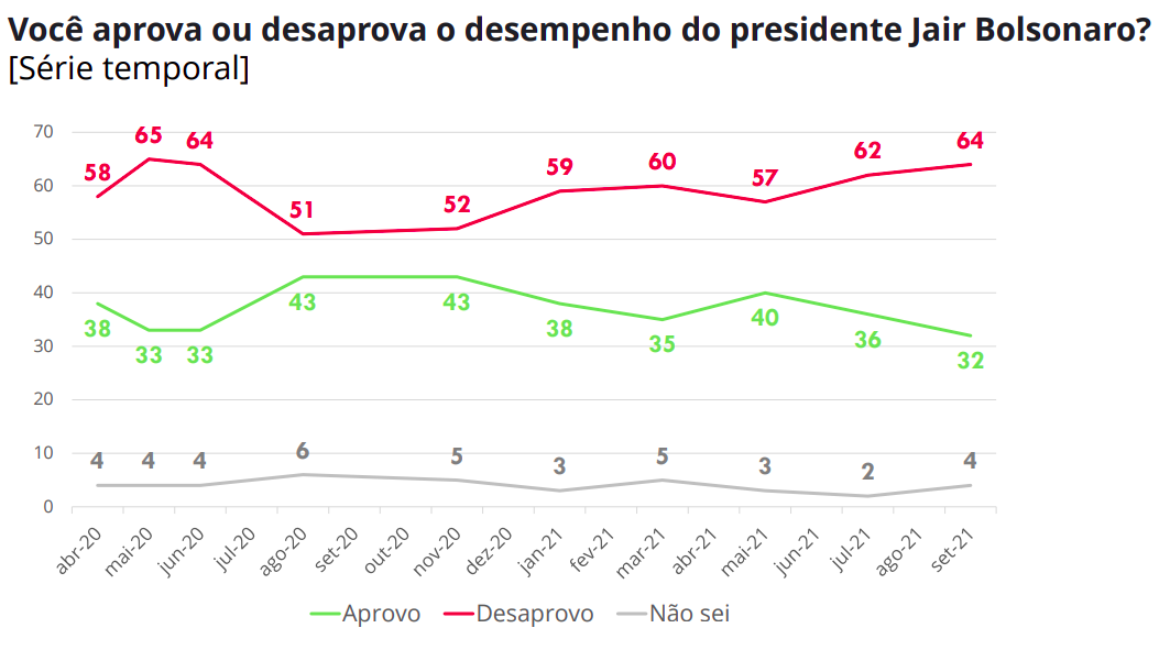 Os gráficos de aprovação do governo e do presidente, mostram uma tendência clara de deterioração. Segundo a pesquisa, 61% consideram o governo ruim e péssimo, e 64% desaprovam o desempenho do presidente.