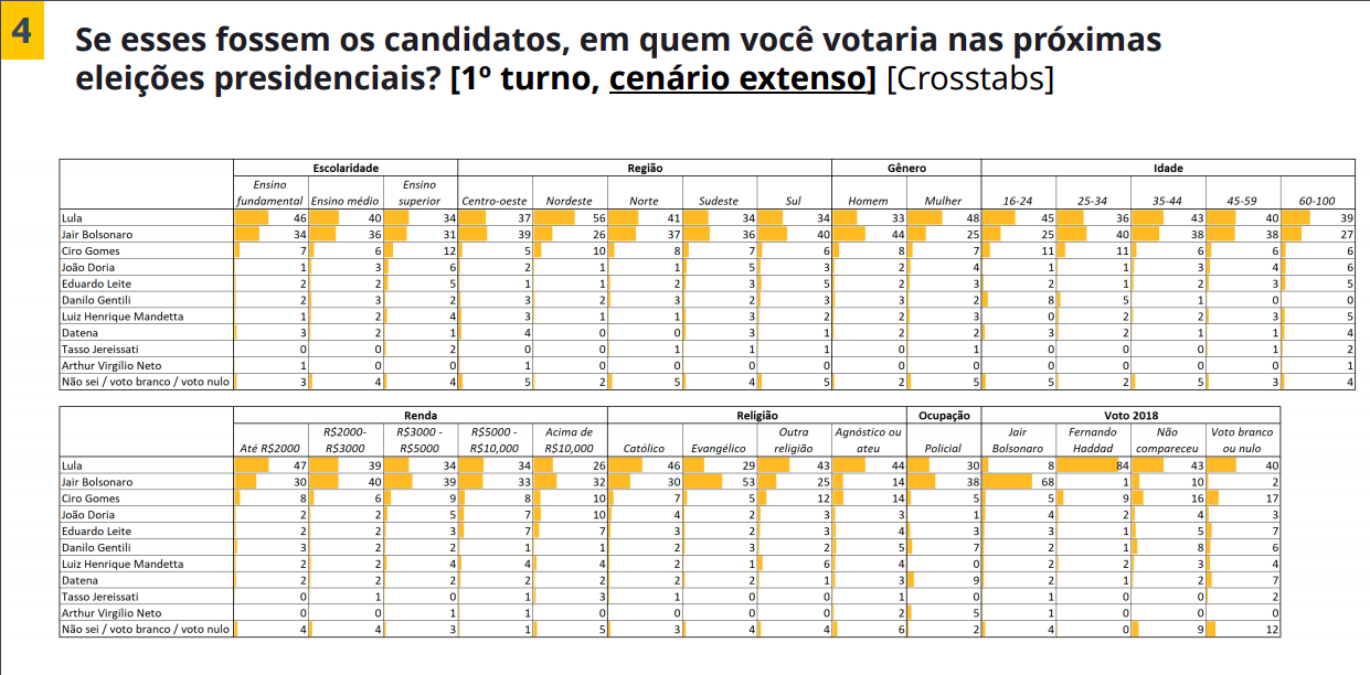 A tabela estratificada (abaixo, clique para ampliar) do cenário extenso traz um dado novo, bem interessante. Bolsonaro tem 38% dos votos de policiais, e Lula 30%. A diferença entre os dois, afinal, não é tão profunda como se imaginava.