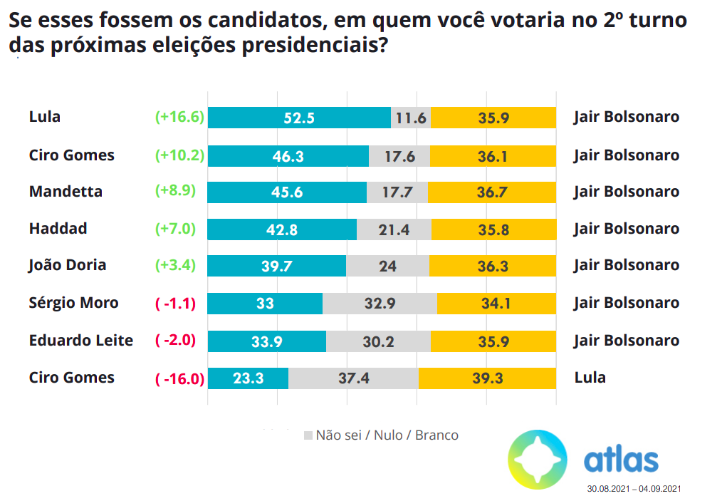 Abaixo, os cenários de segundo turno da pesquisa Atlas. Bolsonaro perde de todo mundo, até mesmo de quem não perdia antes, como Doria e Leite.