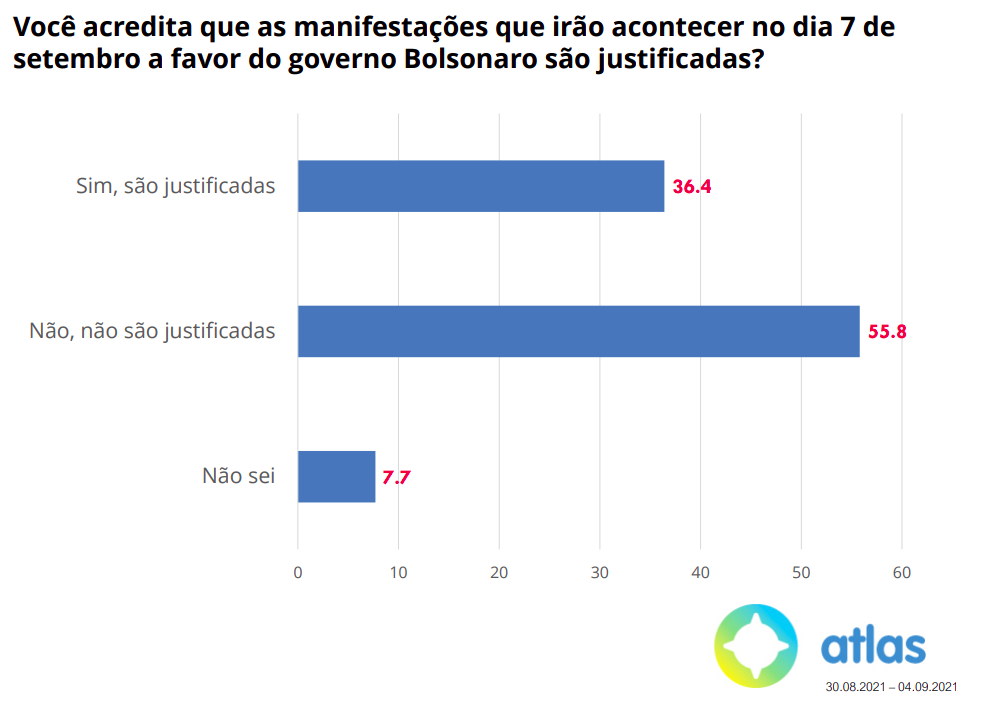 Achei interessante contudo esse gráfico da pesquisa, que mostra que 56% dos entrevistados consideram que as manifestações de Bolsonaro “não são justificadas”. Apesar disso, os 36% que as consideram justificadas mostram a resiliência do presidente.