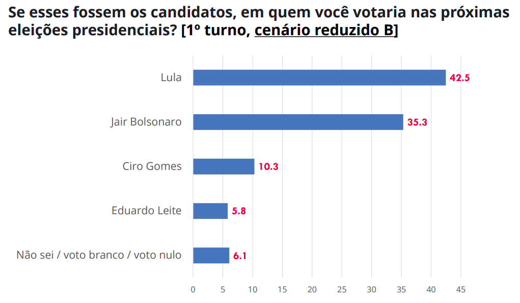 Bolsonaro está empatado tecnicamente com Lula no Centro-Oeste e Sudeste, mas tem vantagem de 6 pontos no Sul.