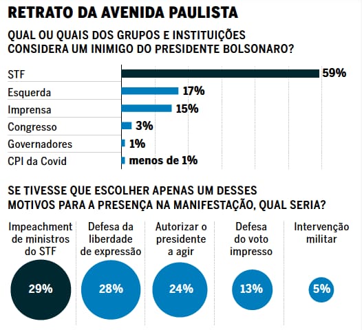 No que diz respeito ao golpismo, cerca de 59% dos que foram para o ato na avenida Paulista diz que o Supremo Tribunal Federal é o principal “inimigo” de Jair Bolsonaro. Já 17% disseram que é a esquerda e 15% a imprensa. Desse total, 29% defendem a derrubada de ministros da Suprema Corte.