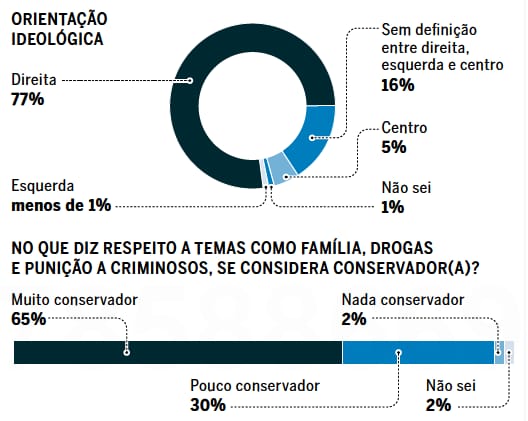 Cerca de 77% dos que foram para os atos golpistas se declaram de direita, 16% sem definição ideológica, 5% de centro, 1% não sabe e menos de 1% são de esquerda. Outro dado revelador é que 65% são “muito conservador”.