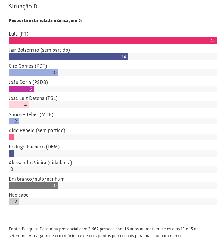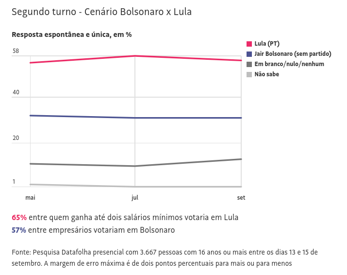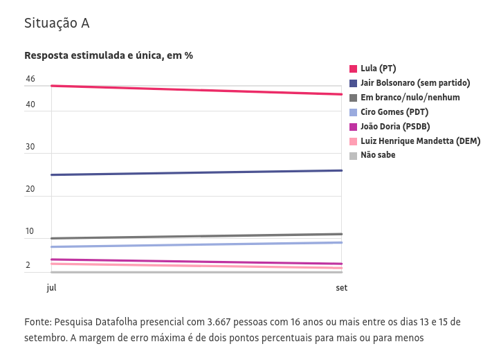 Com 3,6 mil entrevistas presenciais realizadas entre os dias 13 e 15 de setembro, é uma das pesquisas mais respeitadas no país. A última edição foi divulgada hoje pela manhã, pela Folha de São Paulo.