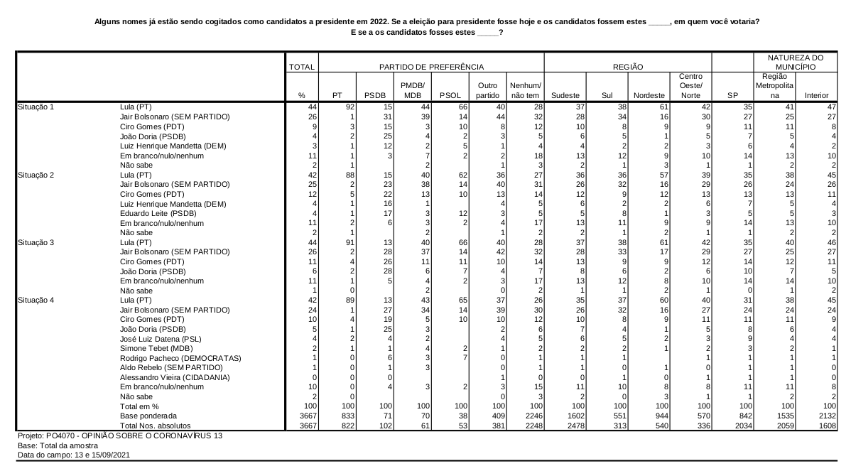 No cenário 4, mais extenso, Lula tem 31%, contra 24% de Bolsonaro e 11% de Ciro.